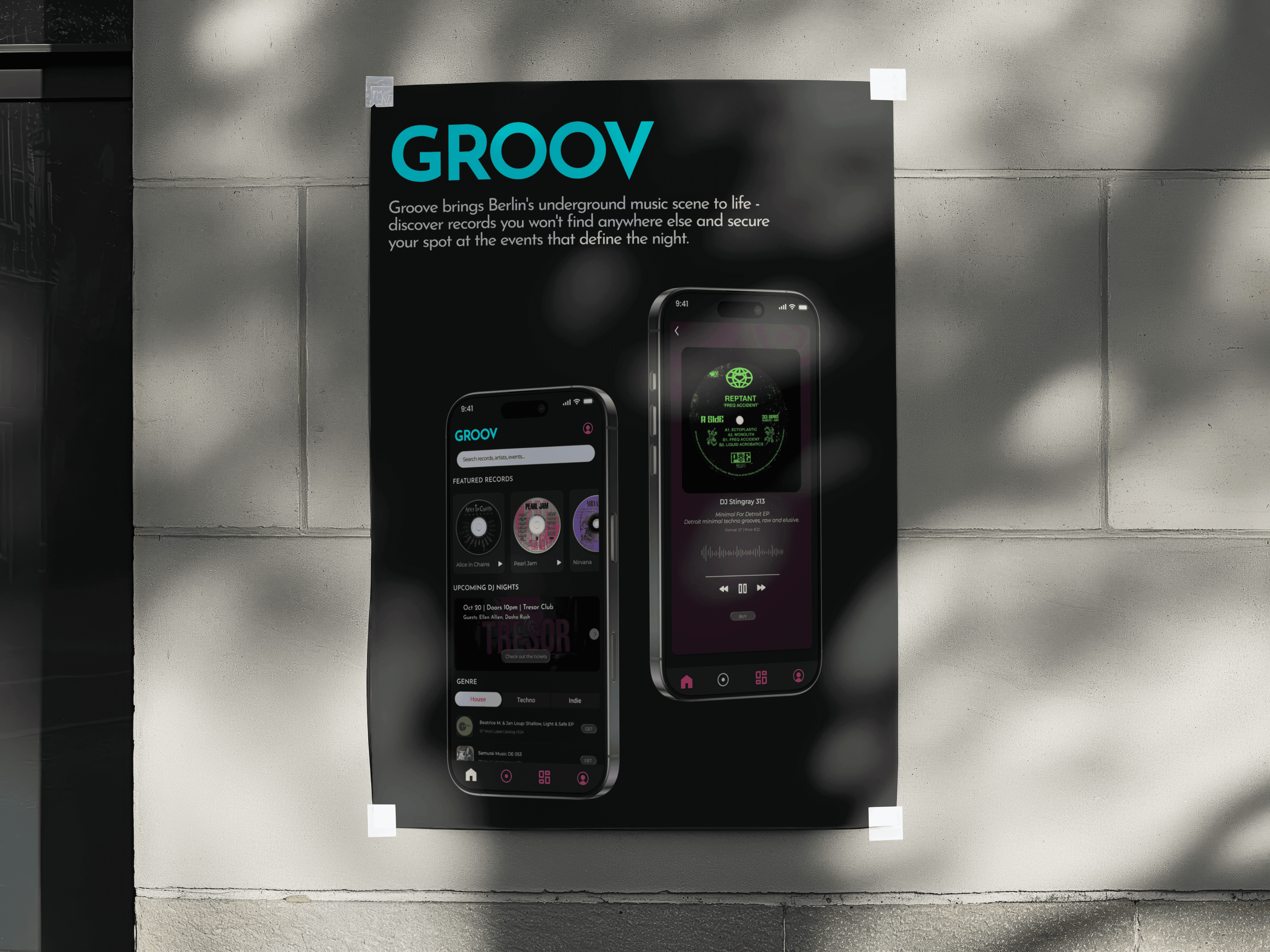 Where vinyl culture meets nightlife. Groove is a mobile concept blending record discovery with underground event bookings for Berlin's music scene.